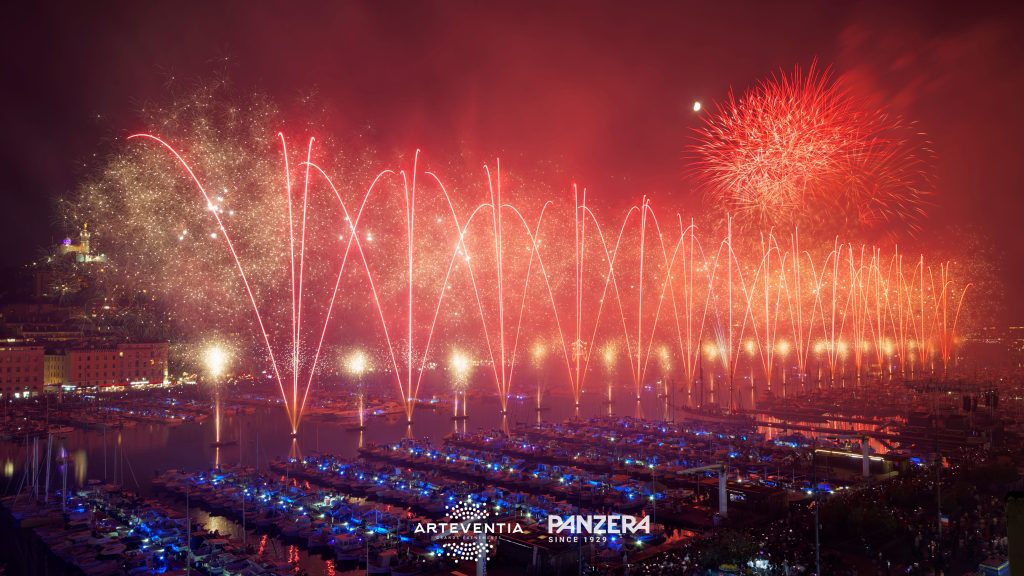 In 2024 and 2025, ARTEVENTIA & PANZERA had the honour of designing and producing these two major pyrotechnic frescoes, launched from the Old Port basin and the Citadel, delivering spectacular staging that blends heritage, sea and light.