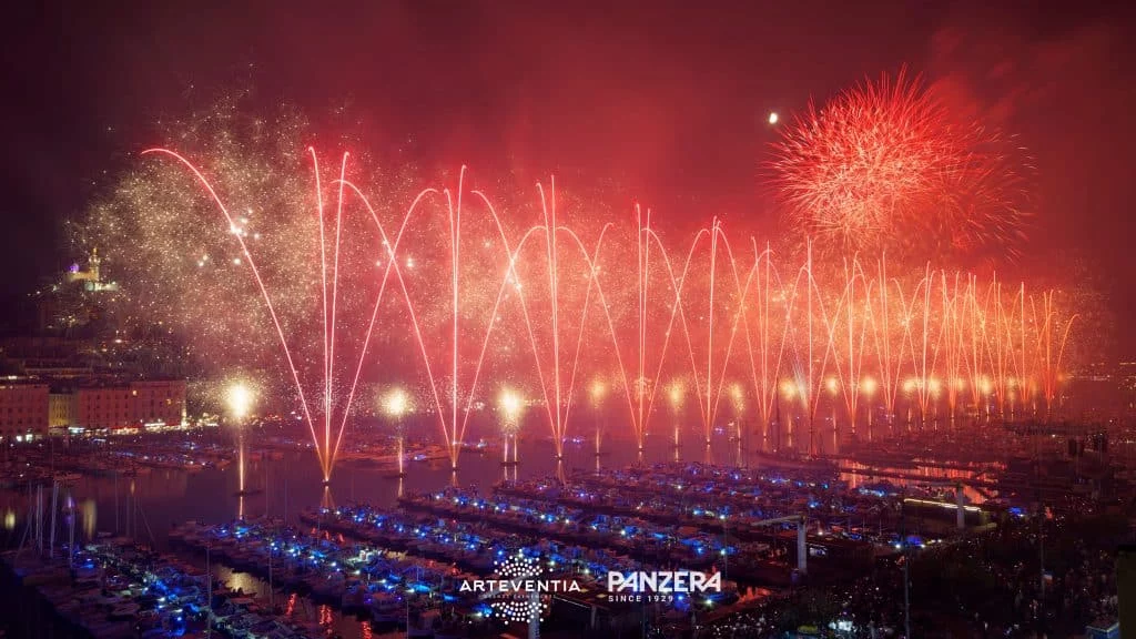 In 2024 and 2025, ARTEVENTIA & PANZERA had the honour of designing and producing these two major pyrotechnic frescoes, launched from the Old Port basin and the Citadel, delivering spectacular staging that blends heritage, sea and light.