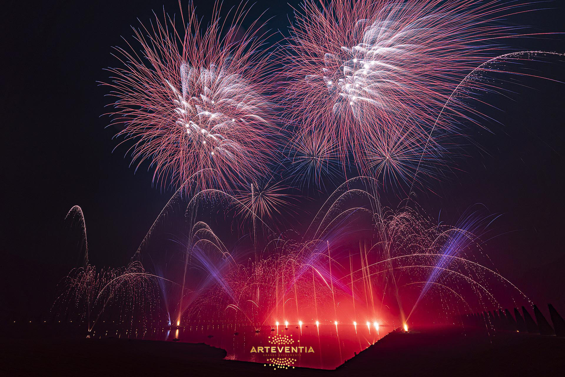 ARTEVENTIA y conçoit une écriture pyrotechnique qui ne se contente pas de « briller », mais qui dialogue avec les jeux de lumière sur l’eau, intégrant musique et airs romantiques classiques (Cherubini, Chopin, Beethoven, Schubert, Berlioz, Bellini, Liszt, Fauré) pour créer une progression émotionnelle et narrative.